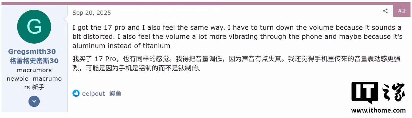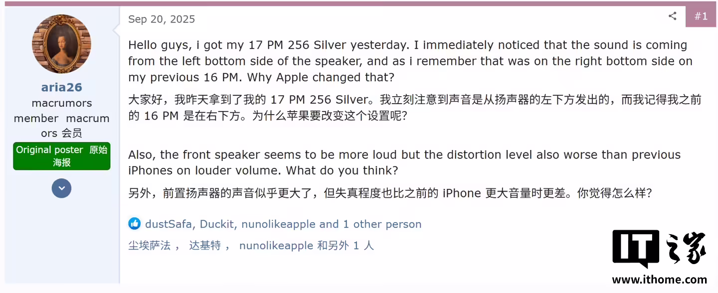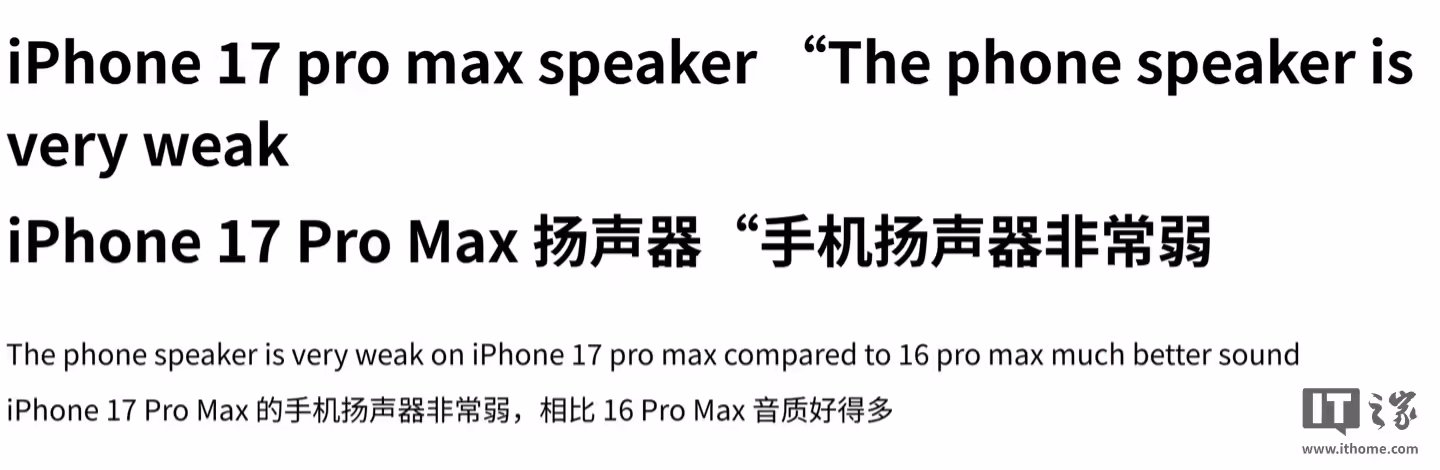 根据 Apple 支持论坛、MacRumors 论坛以及 Reddit 社区部分用户反馈,受影响用户反馈扬声器异常,CNET 分析师 Jeffrey Mizrahi 称,他的 iPhone 17 Pro Max 上的音频听起来比之前的 iPhone 16 Pro Max 更“清脆”,在听 John Oliver YouTube 视频中的对话时,他注意到声音有些失真。